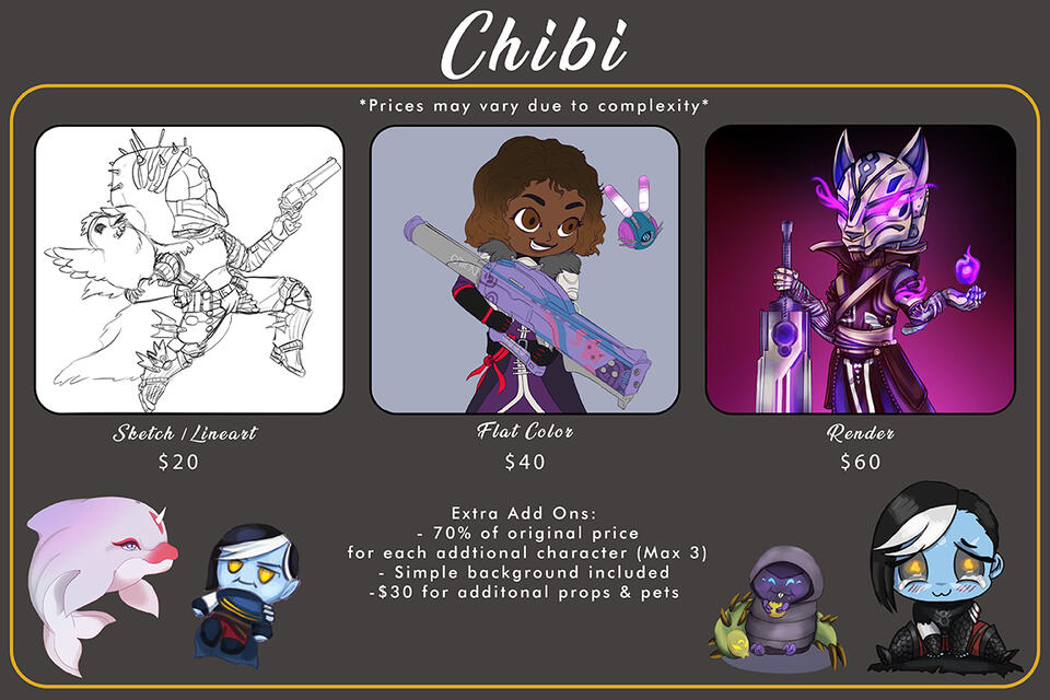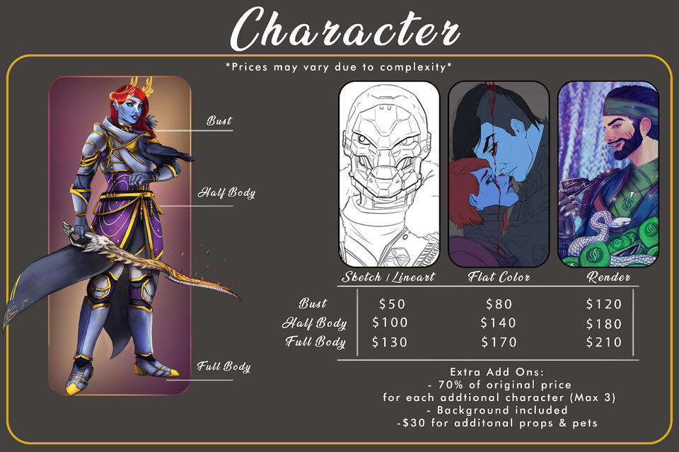 PROJECT TIMELINE: Commissions typically take as long as two weeks to a month depending on complexity. I open three slots per month and I make announcements on all of my socials.After paying for the commission, I will show you a sketch. This is the only time you can request major changes without an additional charge. Once the sketch is agreed upon and finalized, only small changes are allowed. EX: colors, lighting, small tweaks.Large composition changes, poses, attire swapping, etc